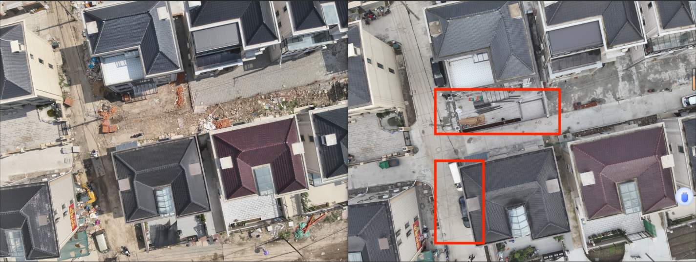 如上面对比图所示,两幅图则为间隔多月的同一场景照片,第二张图比第一张图新建了私人住宅的围墙和公路的电线杆,在下图的点云视角后,围墙和电线杆用红色的点标记出来了。同时,用户还可以根据需要调整对比内容的大小和范围,提高识别的灵活性和准确性。