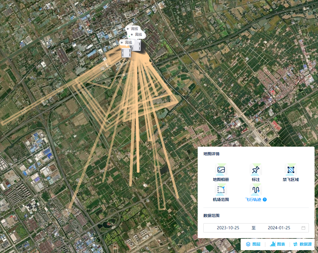 此外历史飞行轨迹页面页面还进行了多元信息汇总展示,涵盖地图相册、禁飞空域、点线面的人工标注、最新实采地图映像、三维模型、高程数据、机场覆盖范围等信息,有效辅助任务管理和综合分析决策。