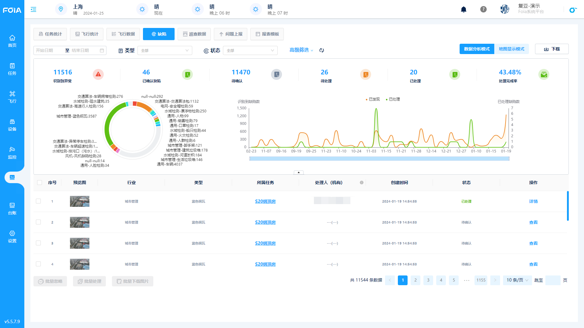 ■ 处理闭环跟踪:支持上传和记录缺陷处理的具体情况,便于跟进和汇总。同时平台会对整体情况进行分析,将识别异常数、已确认缺陷、缺陷处理完成率等统计结果以报表、列表、图表等形式展现,便于用户对数据直观比较、分析、汇报。